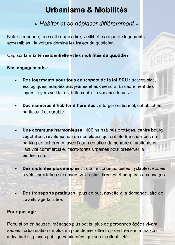 Notre programme est synthétisé en 3 axes, que nous vous présentons ci-après. Nous les avons développé lors de notre réunion publique du 05 mars 2026, à 20h à la salle du conseil.